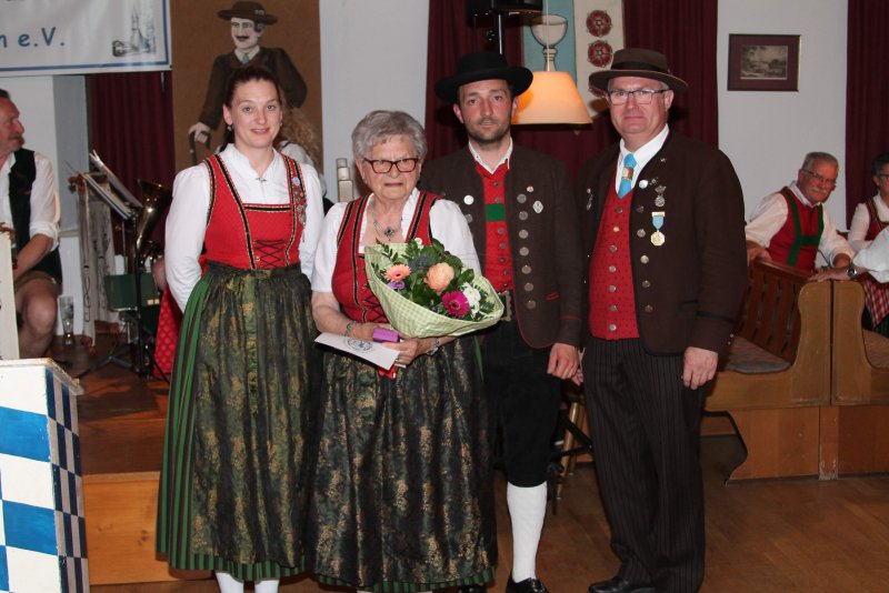 In diesem Jahr stand wieder eine besondere Ehrung an. So konnte Carina für 70 jährige aktive Mitgliedschaft beim Verein Fahnenmutter Traudl Wiesmeier ehren. Eine solche Ehrung konnte der Heimat und Trachtenverein nun schon zum dritten mal vornehmen. Carina Böse übergab Traudl einen Silbertaler mit Gravur für 70 Jahre Mitglied beim Verein. Harald Listl steckte Traudl Weismeier die Ehrennadel an und überreichte die Ehrenurkunde des Gau Niederbayern.